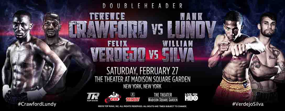 Undefeated superstar champions TERENCE “Bud” CRAWFORD and FELIX “El Diamante” VERDEJO will make their 2016 debuts in title defenses,This Saturday! February 27, at the “Mecca of Boxing” — The Theater at Madison Square Garden. Crawford, the two-division world champion and 2014 Fighter of the Year will be defending his World Boxing Organization (WBO) junior welterweight world championship belt against Top-10 contender “Hammerin'” HANK LUNDY.