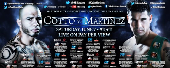 Promoted by Miguel Cotto Promotions, Top Rank®, DiBella Entertainment and Sampson Boxing, in association with Maravilla Box, Tecate and Madison Square Garden, the Cotto – Martínez World Middleweight Championship event will be produced and distributed live by HBO Pay-Per-View®, beginning at 9:00 p.m. ET / 6:00 p.m. PT.