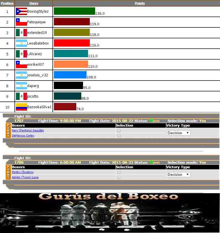 ‘Gurús del Boxeo’ es un concurso donde los participantes del juego seleccionan el ganador y la vía de victoria en ciertas peleas escogidas por el administrador. Los puntos son otorgados basados en los resultados y sus selecciones. El torneo dura tres meses y al concluir el mismo, el participante que haya acumulado el mayor número de puntos es clasificado el ‘Gurú del Boxeo’