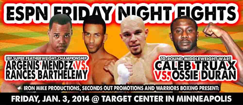 Ossie “The Ghanaian Gladiator” Duran (28-11-2, 11 KOs) will step in to face hometown hero Caleb “Golden” Truax (23-1, 4 KOs) of Minnesota, as the ESPN Friday Night Fights-televised 10-round co-featured bout on Friday, January 3, 2014, at Target Center in Minneapolis, Minnesota.