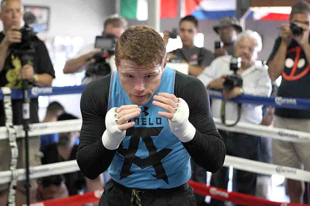 Tuesday, Canelo spent more than two hours at the House of Boxing. He worked up a heavy sweat during a spirited, 75-minute-plus workout that consisted of jumping rope, shadow-boxing, smacking the heavy bag, hitting the double-ended bag and working the speed bag. Before and after, he did interviews, signed autographs, posed for photos and mingled with his many fans.