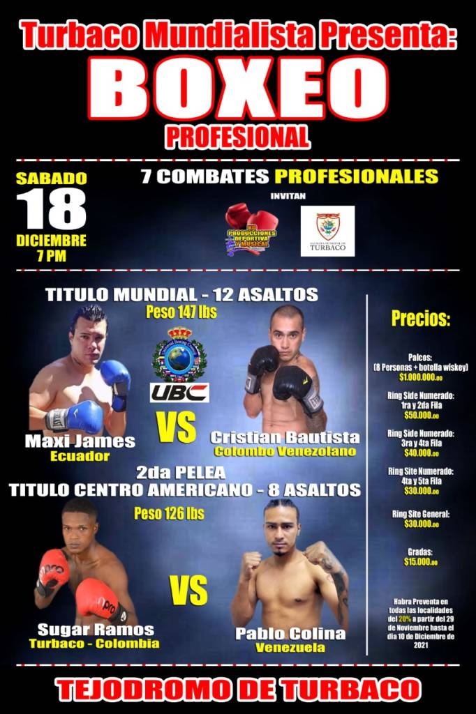 El cartel que se proyectará el próximo sábado 18 de diciembre contará con la disputa del cetro orbital UBC 140 libras entre el invicto pegador argentino Maximiliano James, ante el colombo-venezolano Cristian Bautista. James ha tenido un recorrido sin mácula en entarimados de Argentina, Chile, Perú, Ecuador, USA y hace su estreno en Colombia con la aspiración de convertirse en el cuarto monarca mundial para el vecino país ecuatoriano.