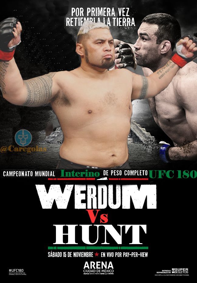 UFC180 que tendrá como evento estelar la pelea por el título de peso pesado interino entre Fabricio Werdum y Mark Hunt y la pelea co-estelar en peso welter entre Jake Ellenberger y Kelvin Gastelum. Además, la final de The Ultimate Fighter Latinoamérica. UFC 180 se transmite el sábado 15 de noviembre a las 6pm MEX/ 9pm ARG, en vivo por UFC NETWORK desde La Arena de Ciudad de México.
