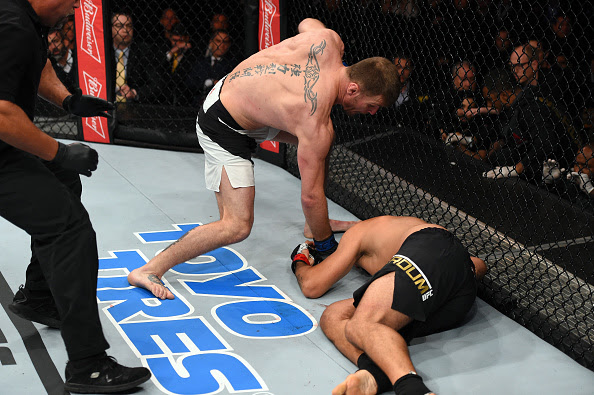 Miocic lanza patadas a las piernas del brasileño, quien intenta cerrar la distancia con los puños. Intercambio intenso de puños hasta que una derecha desconecta a Fabricio sin oportunidad de levantarse.