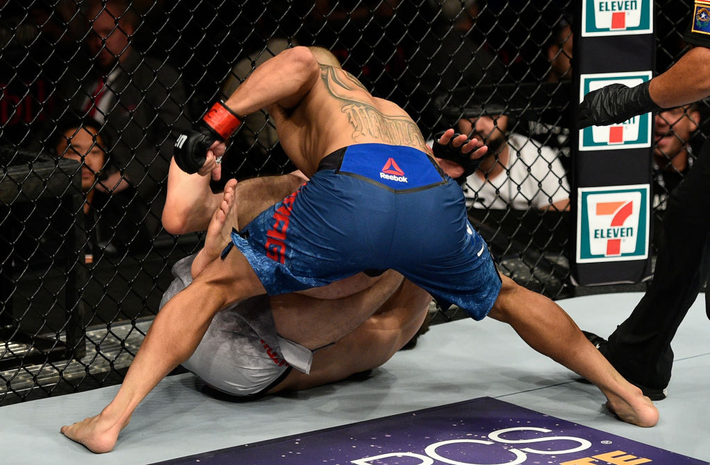 Going into Round 2 Leites was leg kick heavy, throwing high and low leg kicks at his foe. Tavares stood his grown checking the kicks and jabbing away or launching looping hooks for the first few minutes. The Hawaain’s jab rarely missed and Leites was making no adjustments at all. At the halfway mark Tavares had busted  up his opponent’s face bad ‎with that crisp jab, the blood dripped from Leites  right cheek as he shot in for a single leg takedown, this time getting it thanks to an outside leg trip. However, Tavares popped right back up by wall walking. Leites tried pulling guard and just fell flat on his back along the Octagon wall as Tavares wasn’t having it and shoved him unto the mat. Leties marched forward in the last few moments of the match as Tavares kept that jab in his face. The blood dripped and Tavares would not quit sticking it in his man’s face thanks to some solid conditioning.