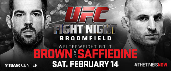 UFC FIGHT NIGHT®: BROWN vs. SAFFIEDINE will air live on FOX Sports 1 at 10 p.m. ET/7 p.m. PT on Saturday, February 14, with the prelims kicking off the evening on FOX Sports 1 at 8 p.m. ET/5 p.m. PT and on UFC FIGHT PASS™ at 7 p.m. ET/4 p.m. PT.