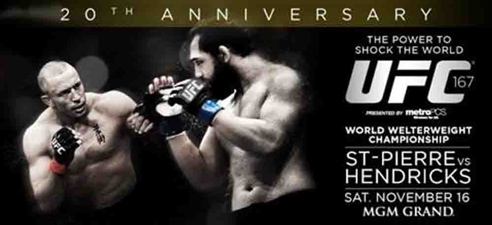 UFC® 167: ST-PIERRE vs. HENDRICKS takes place Saturday, November 16, live from MGM Grand Garden Arena in Las Vegas. The event will air live on Pay-Per-View at 10 p.m. ET/7 p.m. PT. on UFC.TV, iN DEMAND, DirecTV, DISH Network, Avail-TVN, and in Canada on BellTV, Shaw Communications, Sasktel, and Viewer’s Choice Canada. UFC 167 will also be shown live in select Fathom Events theaters across the U.S. Tickets are available at participating theater box offices and online at www.FathomEvents.com.