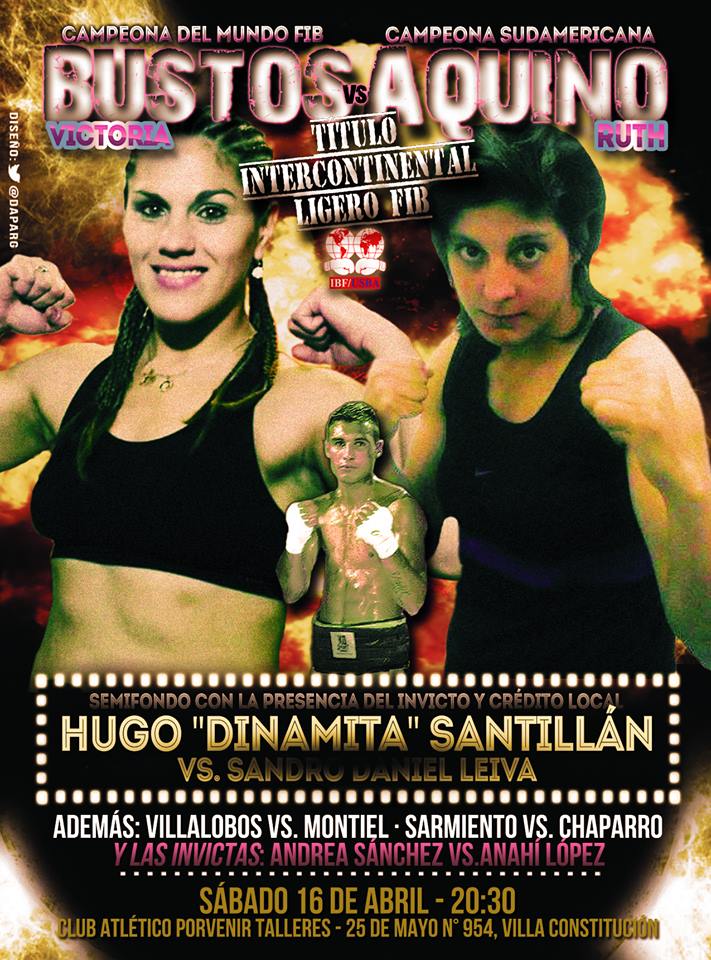 Dicho evento, tendrá como protagonista estelar a la actual campeona del mundo de peso ligero, perteneciente a la Federación Internacional de Boxeo (FIB), la rosarina Victoria Noelia “la Leona” Bustos (14-3), que se medirá con la actual monarca sudamericana de la categoría, la bonaerense Ruth Sthepanie “la Roca” Aquino (7-1, 1 KO), donde estará en disputa la corona intercontinental FIB de la división, que se encuentra vacante, en un combate pactado a la distancia de diez asaltos de 2×1.