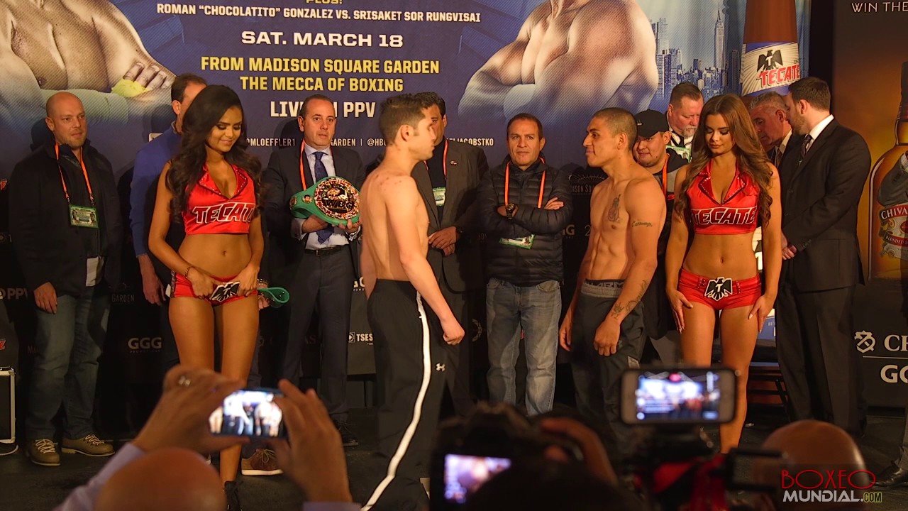 Super flyweights Carlos Cuadras 115.6 lbs and David Carmona 115.8 lbs both weighed in for their fight tomorrow on the undercard of Golovkin vs Jacobs.