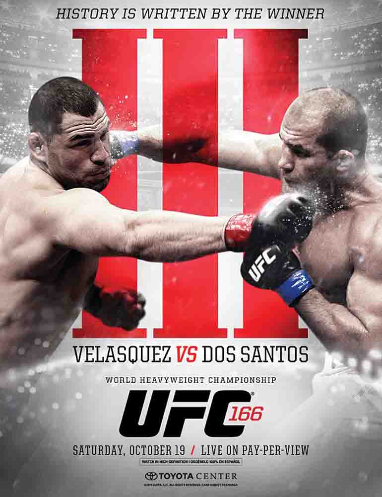 Cain Velasquez’ (13-1) solid chin seems to have grown stronger with each fight, his great conditioning has gotten more intense, and he & his team’s ability to formulate a successful game plan is remarkable as highlighted by his most recent victory over Junior “Cigano” Dos Santos (16-3) this past weekend for the UFC 166 PPV headliner. The Toyota Center hosted the latest installment to the rivalry between these two giants concluding in the form of a trilogy which has seen three fights with the UFC Heavyweight Championship on the line each time. Cain lost the first battle via 1st round KO, Dos Santos lost the rematch by way of unanimous decision and for the final episode, Cain defended his crown with a TKO stoppage of “Cigano” thanks to some devastating strikes in the 5th round. The punches were brutal indeed but what made their sting more potent was the way Velasquez set them up; he took Dos Santos’ legs and cardio away by pinning him along the cage wall round after round from the opening bell, smothering him with shots on the inside be it elbows or short punches to the face or knees to his foe’s inner thigh. Junior wouldn’t give in however, relentlessly trudging on, staying in the fight thanks to his amazing one-punch KO power but it had slowly diminished as the champion stuck to the strategy of keeping the fight at close quarters by using his wrestling and pressing his opponent’s back along the wall, rarely allowing the challenger to find his range. Even the game changing left hooks or over hand rights from Dos Santos that found their mark when the two traded appeared to not have the same impact as they did in their previous battles thanks to the constant aggression and take down attempts from Velasquez.