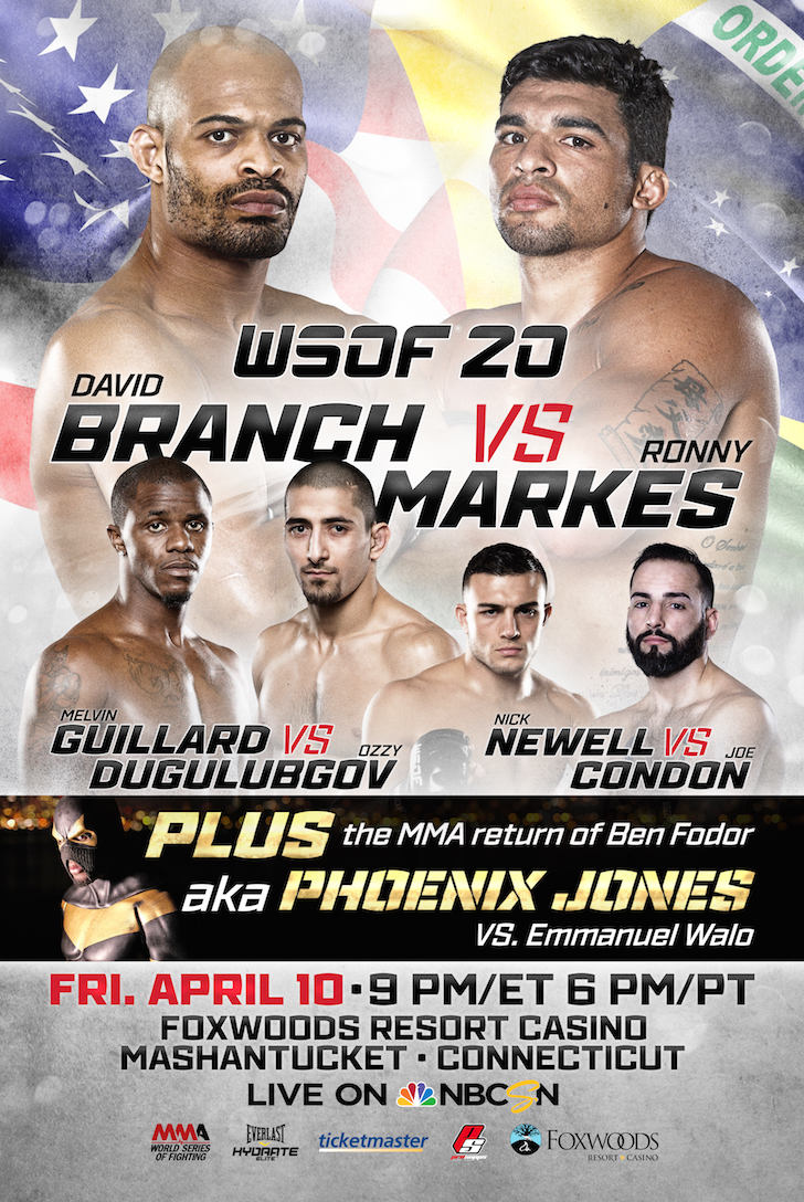 The live NBCSN telecast of WSOF 20: Branch vs. Markes will begin at 9:00 p.m. ET/6:00 p.m. PT.