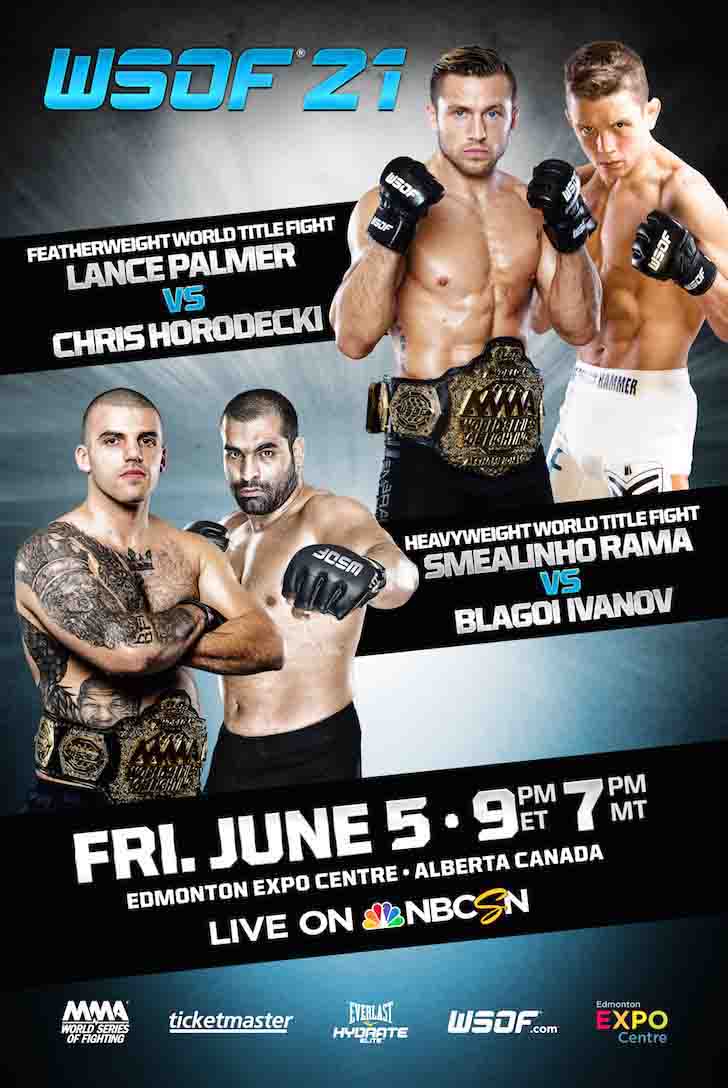 Headlined by a world featherweight (145 pounds) championship showdown between reigning kingpin Lance Palmer (9-1) and Canadian challenger and battle-tested veteran Chris “The Polish Hammer” Horodecki (21-5-1), WSOF 21: Palmer vs. Horodecki will also feature a much-anticipated contest between WSOF World Heavyweight Champion Smealinho “The Prince” Rama (9-1), who will put his coveted title on the line against Bulgarian standout Blagoi Ivanov (11-1).