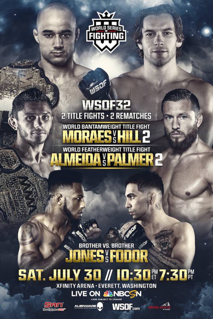 LAS VEGAS –World Series of Fighting (WSOF.com) announced today the completion of a nine-fight preliminary card for the highly-anticipated WSOF32: Moraes vs. Hill II, world championship doubleheader that airs live on NBCSN at 10:30 p.m. ET/7:30 p.m. PT from XFINITY Arena in Everett, Wash. on Saturday, July 30.
