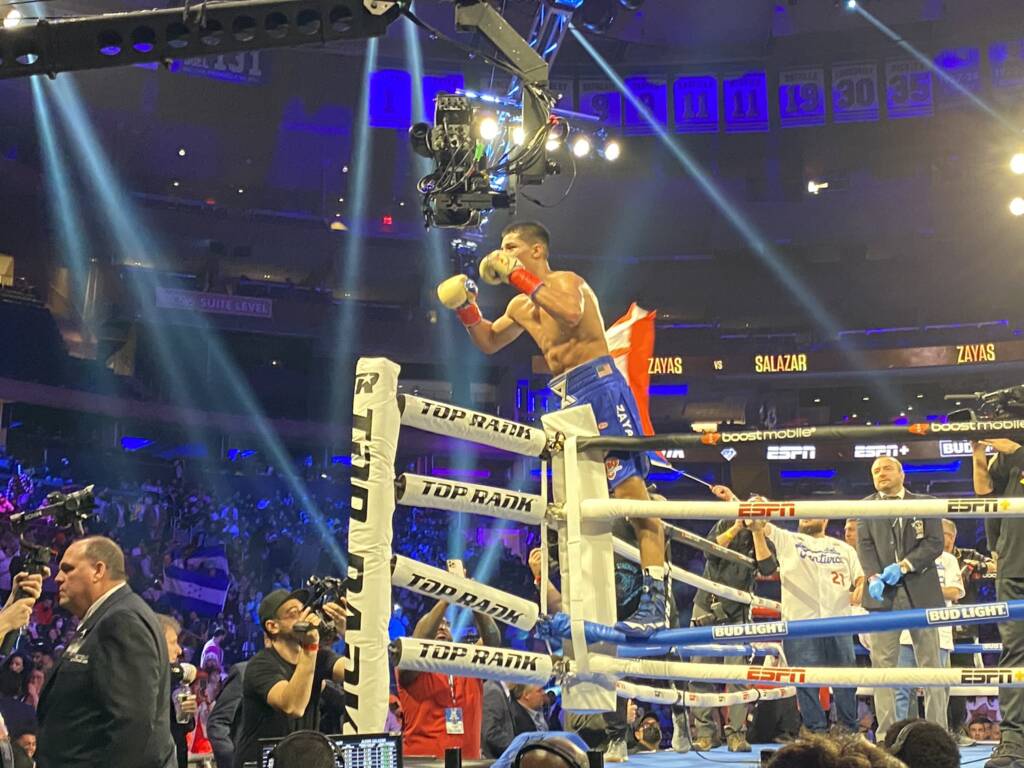Xander Zayas continuó metódicamente su ascenso en la división de peso mediano junior el sábado por la noche. El prospecto puertorriqueño de 20 años tuvo un comienzo rápido contra Alexis Salazar, lidió bien con el movimiento de Salazar y el jab más tarde en su pelea y ganó decisivamente una decisión unánime de ocho asaltos en el Madison Square Garden. Zayas (15-0, 10 KOs) ganó su pelea por grandes distancias en las tarjetas de puntuación de los jueces Ken Ezzo (80-72), Don Ackerman (79-73) y Kevin Morgan (79-73).
