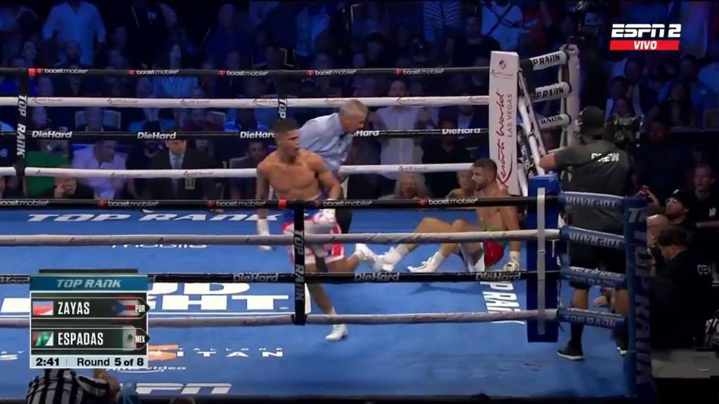 Zayas hizo sentir su presencia durante la tercera ronda. Un combo de gancho de mano derecha e izquierda aturdió brevemente a Espadas, la secuencia funcionó tan bien que Zayas la repitió de inmediato con resultados igualmente exitosos. Espadas intentó pelear desde las cuerdas pero no pudo dar un puñetazo ya que inmediatamente fue recortado por un clásico uno-dos. Zayas sacudió a Espadas con un gancho de izquierda en los últimos 30 segundos del asalto.