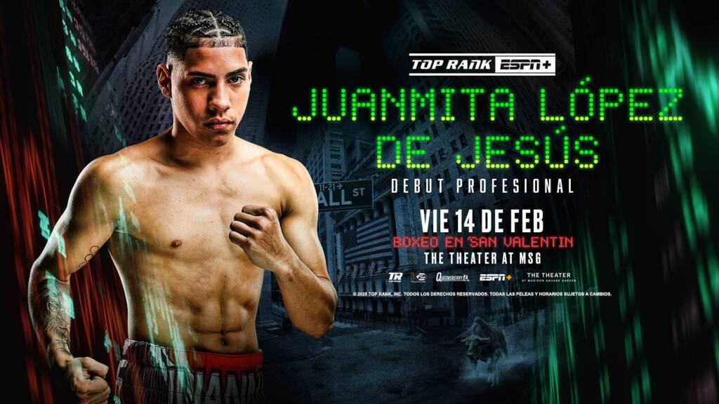 El hijo del ex campeón mundial en dos divisiones, Juan Manuel “Juanma” López, combatirá por primera vez como professional en un pleito a cuatro episodios en peso junior gallo frente a Bryan Santiago (1-1-1) el viernes 14 de febrero en el Theater del Madison Square Garden.