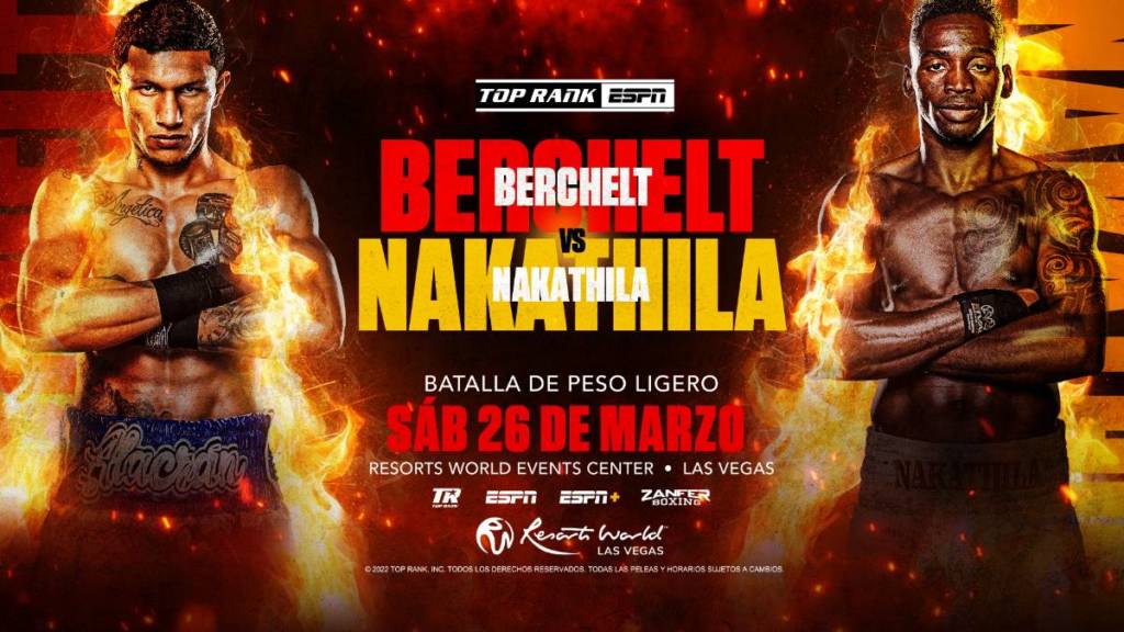 Los combates Berchelt vs Nakathila y Vivas vs Báez serán televisados en vivo por ESPN y ESPN Deportes (transmisión simultánea por ESPN+) a las 10 p.m. ET/7 p. m. PT.