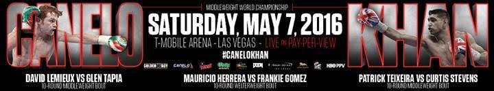 Canelo vs. Khan, a 12-round fight for Canelo’s WBC, Ring Magazine and Lineal Middleweight World Championships, is promoted by Golden Boy Promotions in association with Canelo Promotions and sponsored by“Cerveza Tecate, Born Bold”, O’Reilly Auto Parts, Casa Mexico Tequila and DOOM® — Fight Like Hell onMay 13. David Lemieux vs. Glen Tapia is presented by Golden Boy Promotions in association with Eye of the Tiger Management and Patrick Teixeira vs. Curtis Stevens is presented by Golden Boy Promotions in association with Main Events. The mega-event will take place Saturday, May 7 at T-Mobile Arena in Las Vegas and will be produced and distributed live by HBO Pay-Per-View beginning at 9:00 p.m. ET/6:00 p.m. PT.