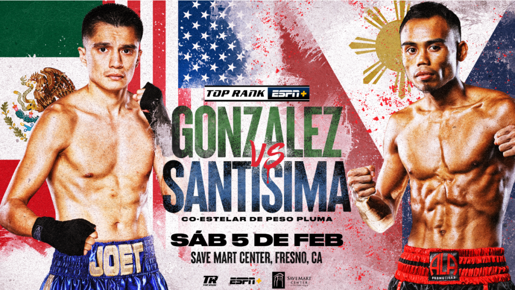 FRESNO, Calif. (3 de enero de 2022) – Joet González, el peso pluma favorito de los fans del sur de California, quien ha retado dos veces por un título mundial, está preparado para otro intento de alcanzar el campeonato. González firmó un contrato promocional de varios años con Top Rank y regresará en una pelea a 10 asaltos contra el ex retador al título mundial, el filipino Jeo Santisima, el sábado 5 de febrero en el Save Mart Center en Fresno, California.
