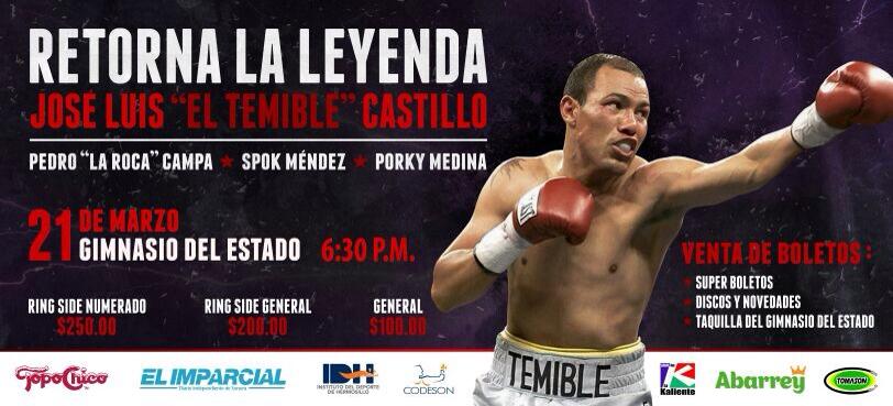 “Retorna la Leyenda” que estelarizara el “Terrible Castillo” en pelea pactada a 10 rounds en peso welter, llevando como rival a Felix Bojorquez “Chupacabras” de los Mochis. Sinaloa, con un record profesional de 17-3-1 11KO quien no pierde desde abril del 2008.