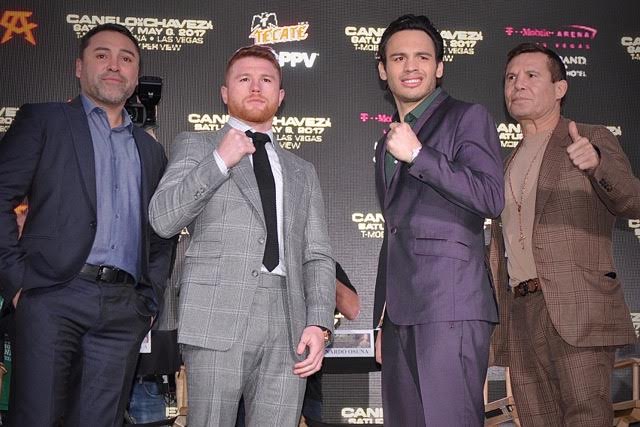 (De izquierda a derecha) Oscar De La Hoya, Saúl Álvarez y Julio César Chávez, hijo y padre)
