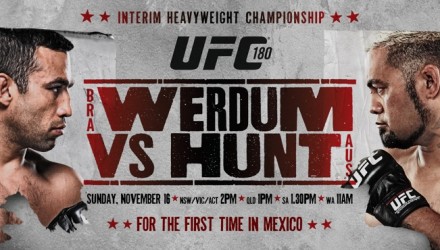 El UFC® 180: WERDUM vs HUNT tomará lugar el próximo 15 de noviembre en la Arena Ciudad de México y presentará la pelea por el campeonato interino de peso completo entre Fabricio Werdum y Mark Hunt, al igual que las batallas finales de The Ultimate Fighter® Latinoamérica.