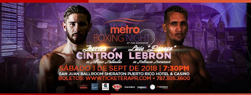 QUÉ: Pesaje oficial para el cartel “Sábado de Campeones en Casino Metro Boxing Nights”, que tendrá en los turnos principales al dos veces olímpico Jeyvier Cintrón en busca del cetro Latino de la OMB en 115 libras ante el mexicano Francisco Alonso Meléndez, y al monarca Latino de la OMB en 126 libras, Luis “Popeye” Lebrón contra el chileno Robinson Laviñanza, este sábado, 1 de septiembre, en el Sheraton Puerto Rico Hotel & Casino de San Juan y que será visto por Wapa 2 Deportes.