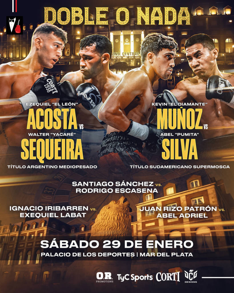 Una apasionante noche de boxeo se avecina en la ciudad feliz, donde el próximo sábado 29 de enero se celebrará el festival “Doble o nada” en el Palacio de los Deportes de Mar del Plata, que contará con un imperdible doble fondo titular que se podrá disfrutar desde las 22:00 por la pantalla de TyC Sports y TyC Sports Play, en el marco de una nueva producción de OR Promotions.