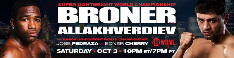 Former three-division world champion Broner(30-2, 22 KOs)returns to his hometown against fellow former world champion Allakhverdiev(19-1, 9 KOs) for the WBA Super Lightweight world title this Saturday, Oct. 3 live on SHOWTIME (10 p.m. ET/7 p.m. PT) from U.S. Bank Arena.