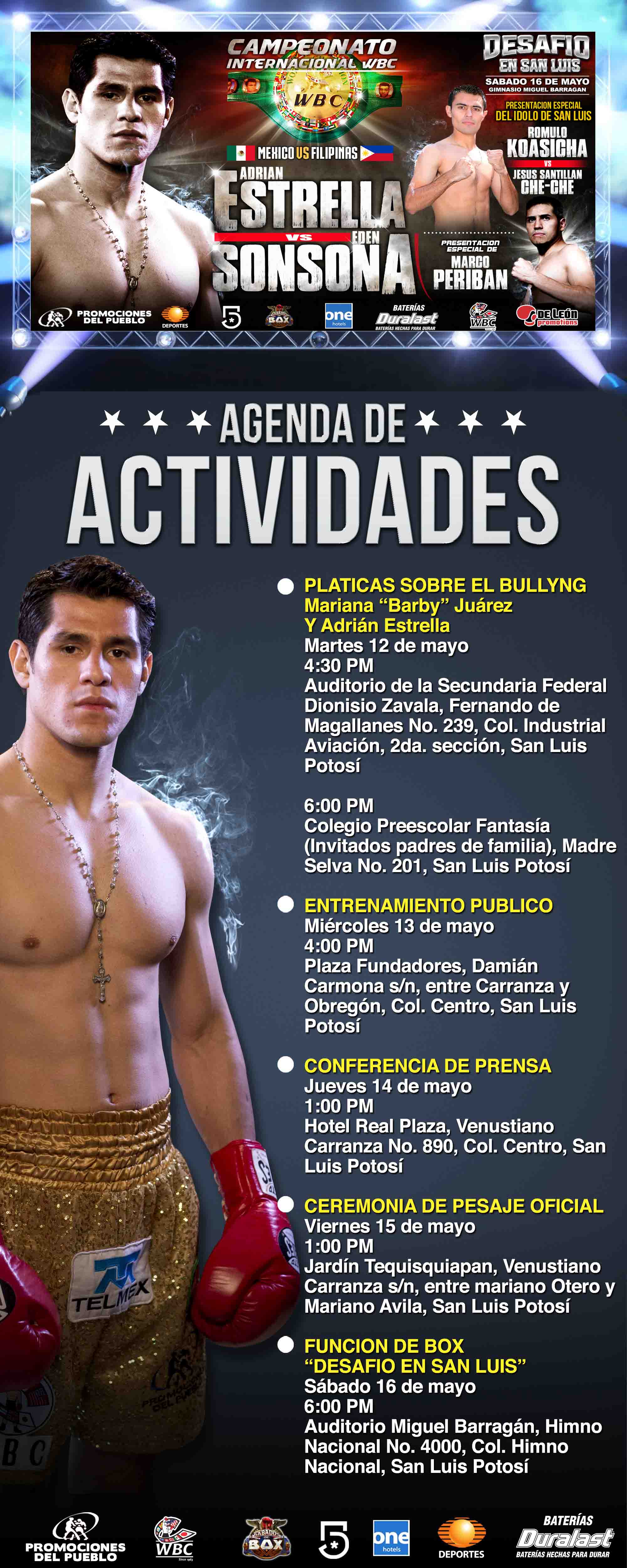 MÉXICO – La cartelera ‘Desafío en San Luis’ tendrá una agitada agenda de actividades promocionales con los protagonistas de la cartelera que será transmitida este sábado completamente en vivo desde el Gimnasio Miguel Barragán de San Luis Potosí por la señal de Televisa Deportes.
