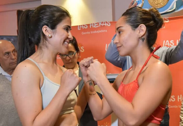En la tarde del jueves, ambas superaron la ceremonia de pesaje llevada a cabo en el Salón Malvinas Argentinas de la Municipalidad de Las Heras, dejando todo listo para su duelo. Tanto Alfonzo como Carabajal registraron 58,900 kg. –129.8 lbs.-.