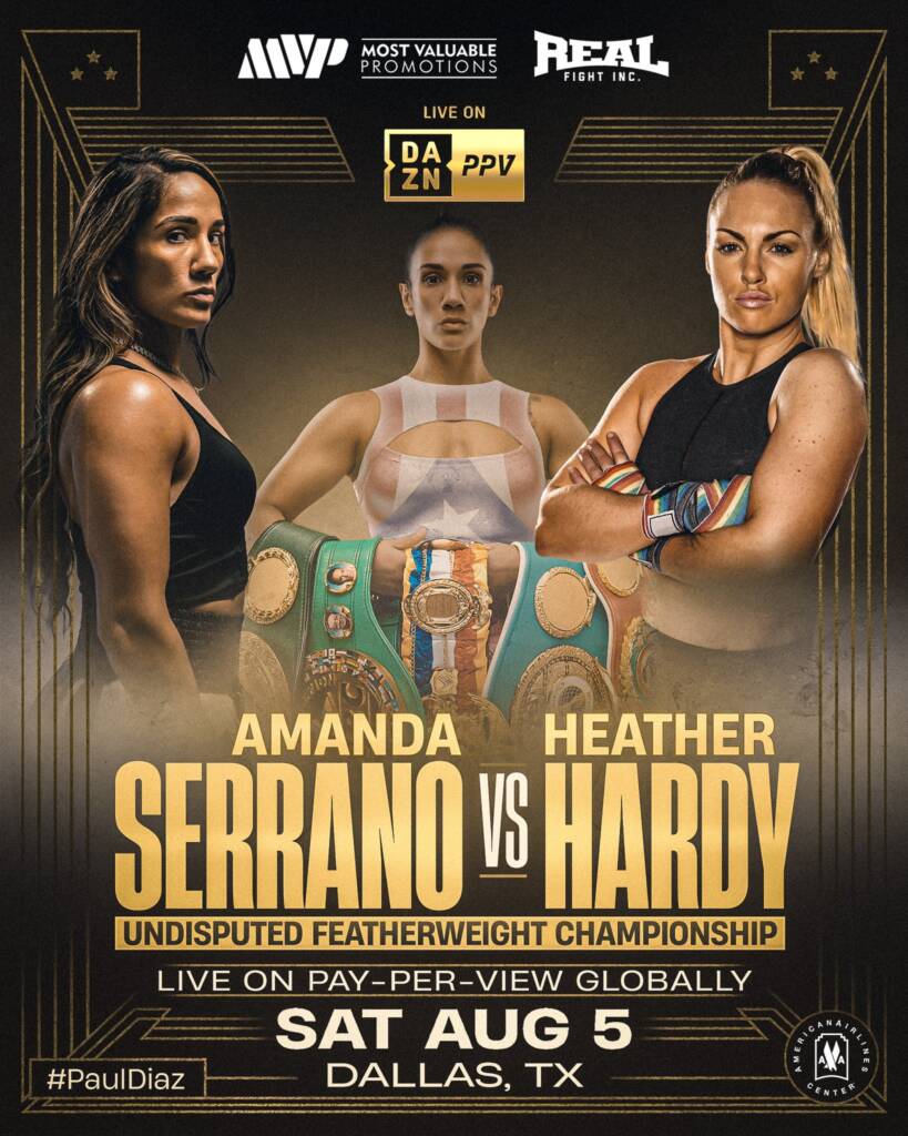 Serrano (44-2-1, 30 KOs), defenderá todos los títulos de las 126 libras (OMB, FIB, CMB, AMB) ante la américo-irlandesa Heather Hardy (24-2, 4 KOs), de Brooklyn, como la pelea semi estelar en pleito de revancha que tomará forma en el American Airlines Center.