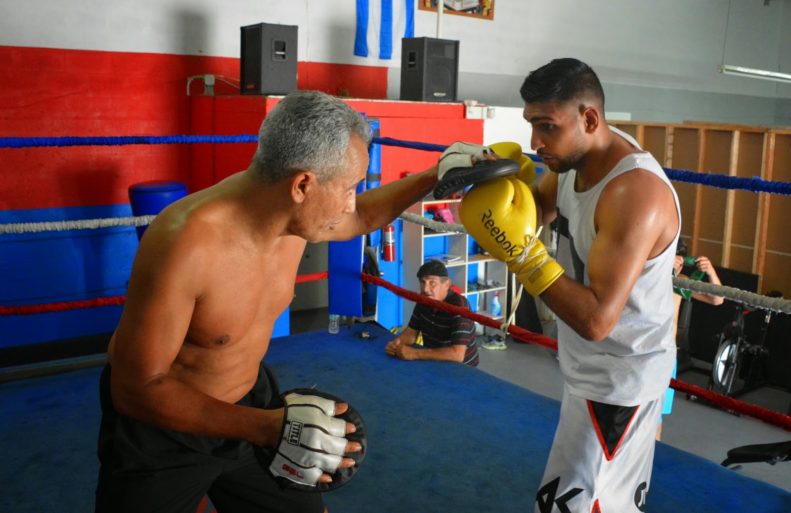 Miami Fla-Ago-28-14. Amir “King” Khan estará algunos días en Miami, Fla; ayer por la tarde agosto 27, el astro ingles se acercó al GYM de Jorge Rubio y aprovechó su visita para hacer algunos ejercicios junto a Rubio, quien le entreno en el pasado.