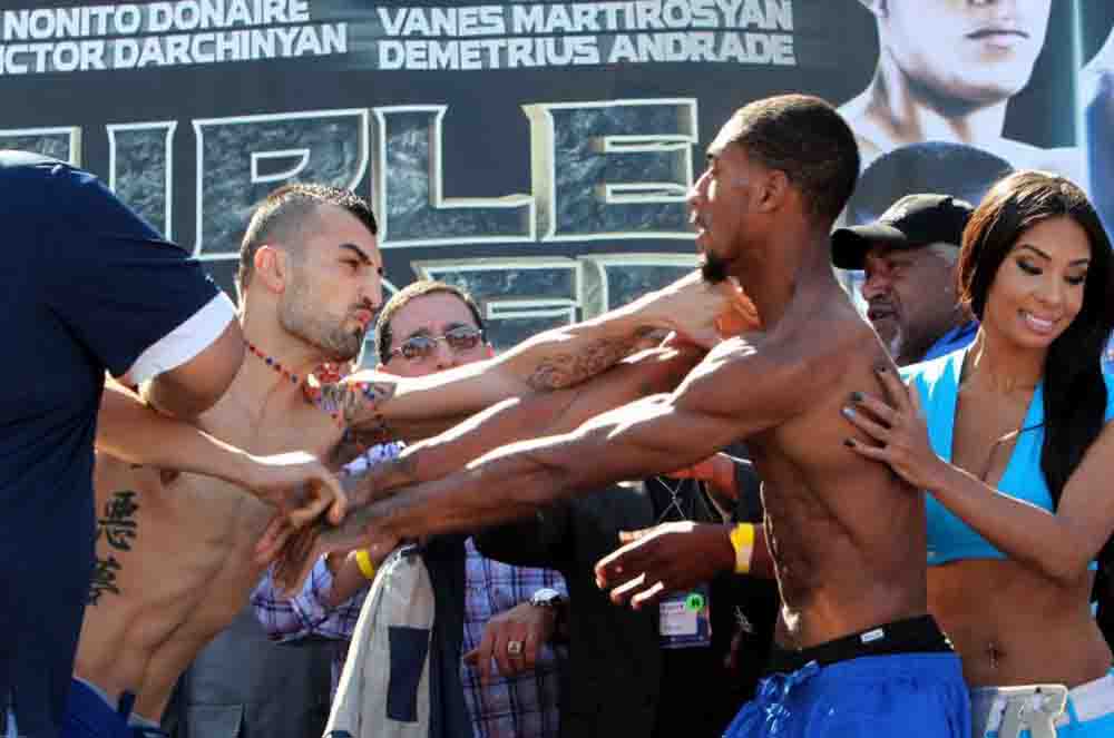 Andrade, 19-0-0 (13KO’s) of Providence, Rhode Island and Martirosyan, 33-0-1 (21KO’s), of Glendale, California both weighed-in at 153.75, just under the junior middleweight limit. Following the weigh-in, a brief scuffle broke out during the obligatory stare down.