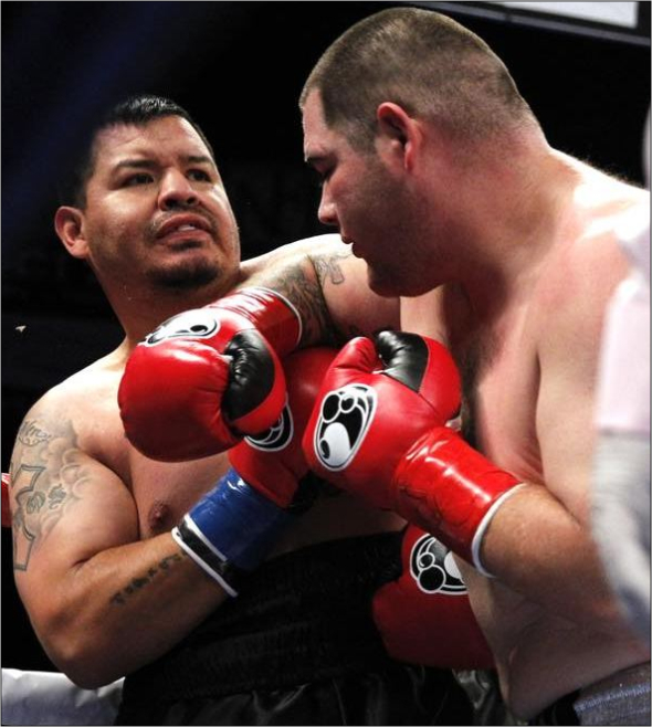 El peso completo mexicano, Andy Ruiz, Junior (izquierda) fue implacable con el estadunidense Kenny Lemos (derecha), a quien se impuso por nocaut técnico en el primer round, en batalla celebrada en la Arena Selland, de Fresno, California, que registró una excelente entrada.