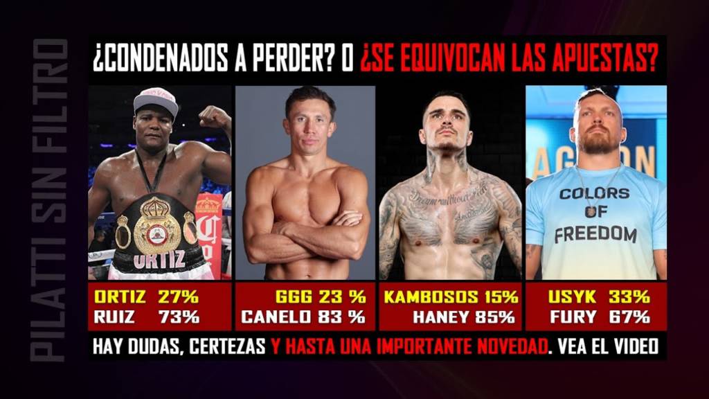 Son cuatro de las grandes peleas en camino y según las apuestas deben ganarlas Andy Ruiz, Canelo Álvarez, Devin Haney y Tyson Fury. Sin embargo, como lo veremos en este video, hay una clave en cada pelea que podría cambiar “la historia de una derrota anunciada”. Elija su pelea en el índice 👇