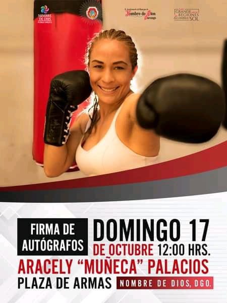 Aracely Palacios, a la cual de cariño le dicen “Muñeca”, pero algunos anunciadores la presentan como “La Destructora”, ella es de la tierra del alacrán (Durango), y por azares del destino se involucró en el mamporro porque quiso poner semáforo en rojo a las burlas y el acoso que sufría en la escuela, y vio en el gimnasio la solución a ese problema, porque de ahí para el real sólo inspiraba respeto en los demás, y ese fue también motivo de gozo para sus seres queridos, que vieron con buenos ojos su decisión de entrenar. No empezó a boxear hasta los 20 años en el ramo amateur, donde construyó una cartulina de más de 60 combates con sólo 4 derrotas y ganando reconocimientos por doquier, tanto estatales como nacionales, y recorriendo muchas tarimas del aporreo a lo largo y ancho de la Republica. A los 23 años decidió dar el salto del tigre a lo profesional, donde la contrincante fue Carolina Arias (la cual ya tenía mucha lona de orgullo en el ramo aficionado), y desde entonces, Aracely ha enfrentado a la crema y nata en la categoría de 112 libras (50.8 kg). Y a pesar de sus 34 primaveras  y palmares no tan atractivos de 10 victorias con 12 derrotas en la división mosca, no baja para nada bandera, y por muy leonas que sean sus oponentes, si se les duerme les gana el tirón con su estilo de boxeo clásico, con sus guantes protegiendo el rostro, apoyando su cabeza en el hombro y moviéndola de lado a lado para  estar al alba y contra-atacar con su derecha como flecha. Y para que vean que tan resistente es en cada batalla, sólo le han contado 2 cloroformos en contra, y para ella fue un honor estar en la preliminar de Canelo-GGG en Las Vegas, lo cual es un sueño para cualquier pugilista, y más si son hembras bravas que no se andan por las ramas. Y la perla del asunto es que Aracely regresa al  zafarrancho rentado el 30 de octubre previo a la noche de endulce y molorada, pero antes que otra cosa suceda, Arecely como sabe como sacar provecho de su imagen montara una sesion de firma de autografos para satisfaccion de sus fanaticos el domingo 17 de octubre a mediodia en la misma Plaza de Armas.