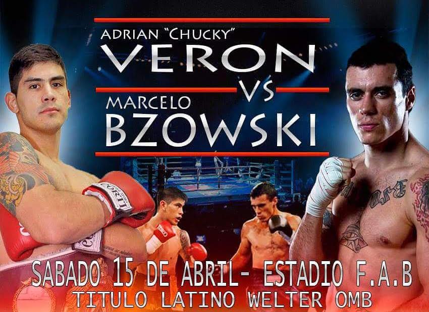 Joven monarca, sigue escalando puestos en los escalafones ecuménicos. Frente a un complicado retador, busca su consolidación para así afianzar su “Proyección mundialista”. El campeón latino welter de la Organización de Boxeo (OMB) y latino plata del Consejo Mundial de Boxeo (CMB), el santacruceño Adrián “Chucky” Verón, se enfrentará al bonaerense Marcelo Bzowski, intentando defender por tercera ocasión su corona OMB, dentro de su segundo reinado, en el combate estelar de la velada que se desarrollará este sábado, 15 de abril, en el estadio de la Federación Argentina de Box (FAB), sito en Castro Barros 75, ciudad de Buenos Aires, Argentina, en una nueva producción de Argentina Boxing Promotions, de Mario Margossian, que será transmitida en vivo a través de TyC Sports a partir de las 23:50, para Argentina y toda América.
