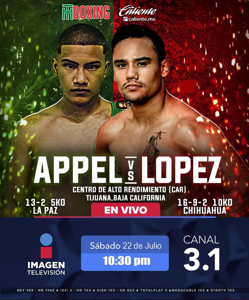 Al continuar con su tónica, TM Boxing, con el apoyo de Box Imagen y Caliente.mx, tal y como lo ha venido haciendo a lo largo de seis meses, se dispone continuar ofreciendo grandes y parejos enfrentamientos, este sábado en el Centro de Alto Rendimiento (CAR) de esta fronteriza ciudad, el talentoso boxeador originario de La Paz, Baja California Sur, Armando Appel, se medirá a un aguerrido guerrero como lo es el chihuahuense Erick ‘Habanerito’ López, en duelo pactado a ocho rounds en 52.100 kilogramos.