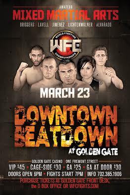 Derek Stevens quien aparte de sus múltiples inversiones en diversos negocios que involucran fabricas y juegos al azar, le encantan los deportes y fue un tiempo dueño del equipo de beisbol local de Las Vegas, ha hecho eventos tanto de boxeo amateur como de kickboxing al aire libre afuera de sus hoteles The D y el Golden Gate, por lo tanto, como en la variedad está el gusto el domingo 23 de marzo prepara una tarima brava para el espectáculo de artes marciales mixtas amateur WFC #19 en el estacionamiento del hotel Golden Gate a espaldas de la Fremont Experience y la calle Main, enfrente del Grey Hound. Sera una tardeada de 3 horas y el primer combate de 15 que se celebraran será en punto de las 7 de la tarde.