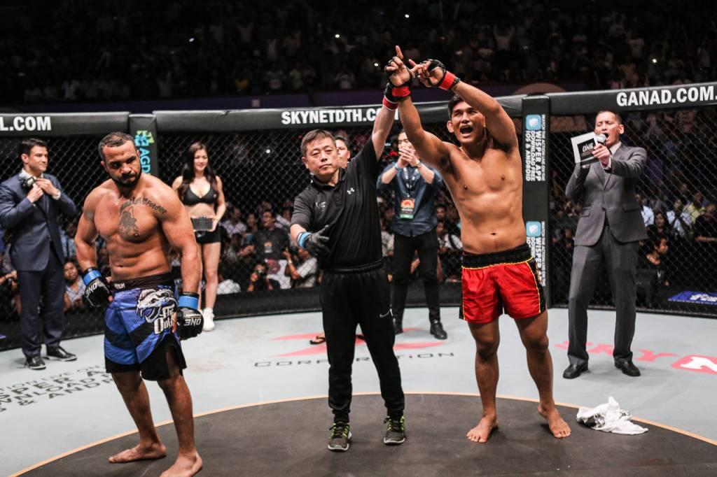 Former flyweight champion Adriano “Mikinho” Moraes of Brazil successfully returned to the ONE Cage after losing the title in his last bout, defeating charismatic opponent Eugene Toquero of the Philippines. Midway into the fight, Toquero rocked Moraes with a flying knee and follow up strikes. This caused Moraes to rely on his Brazilian Jiu-Jitsu skills to carry him to victory. Once on the mat, Moraes sunk in a D’Arce Choke to seal the deal.