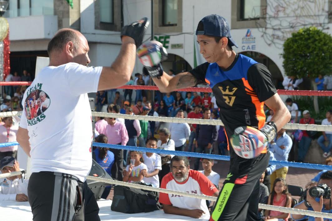 El orgullo de Otumba, Estado de México; quien marcha invicto como profesional, escaló el encordado montado especialmente para la ocasión entre la ovación de los presentes, y realizó ágiles movimientos de boxeo sombra y mostró que posee un golpeo certero y poderoso durante su ejecución con las manoplas.