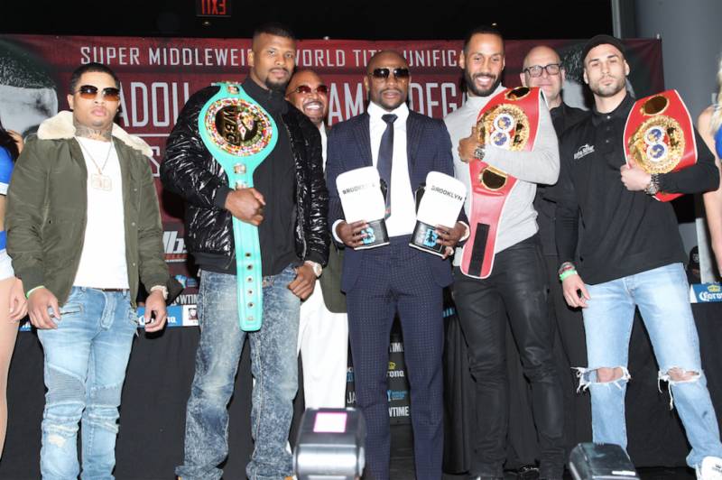 BROOKLYN – A star-studded press conference took place at Barclays Center in Brooklyn on Wednesday, as Floyd Mayweather, along with several New York boxing “ambassadors,” signified the return of boxing to New York by announcing the super middleweight world championship unification fight featuringBadou Jack against James DeGale that will take place Saturday, January 14 at Barclays Center in Brooklyn and live on SHOWTIME®.