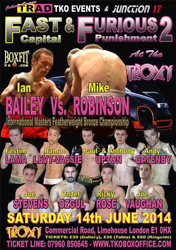 Tickets, priced £30 (Gallery), £35 (Floor Table) and £60 (Ringside), for the Johnny Eames TRAD TKO Events promoted ‘FAST & FURIOUS 2 – CAPITAL PUNISHMENT, at The Troxy in Limehouse, London E1 on Saturday 14th June 2014, are available on-line at www.tkoboxoffice.com or in person from the TRAD TKO Boxing Gym in Canning Town, London. For further information call 07960 850645