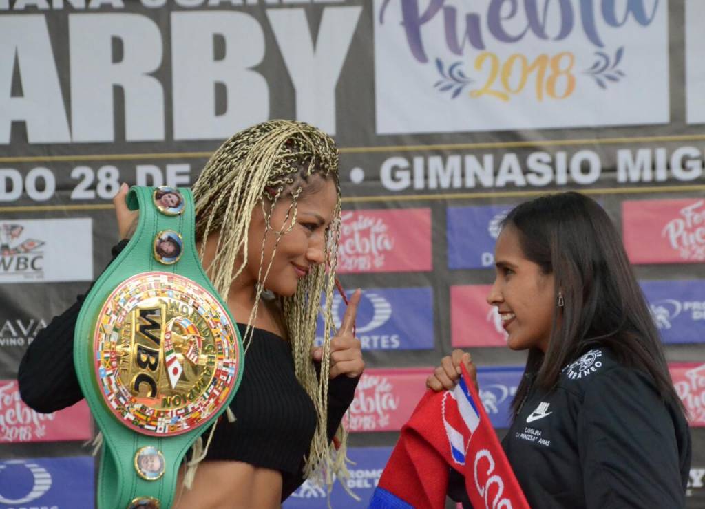 La campeona mundial Mariana ‘Barby’ Juárez se vio las caras este jueves con la retadora costarricense Carolina ‘Princesa’ Arias en las instalaciones de la Feria de Puebla 2018, para la presentación a los medios de comunicación de la espectacular papeleta de los tradicionales ‘Sábados de Box’.