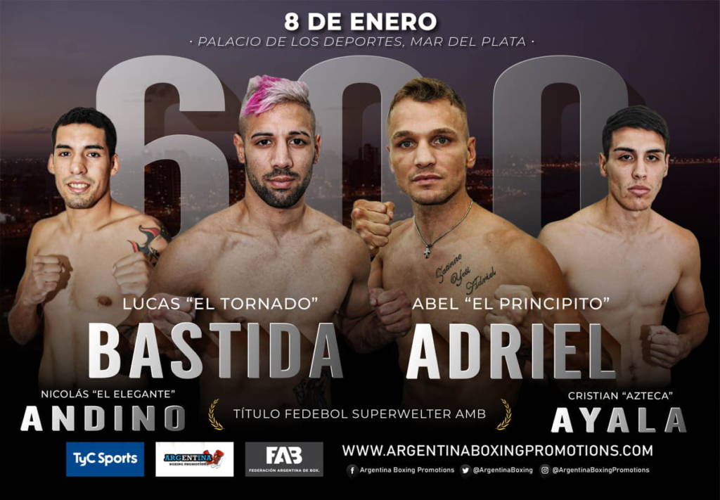 Argentina Boxing Promotions celebra su evento número 600 desde su creación con una gran noche. Semejante récord convierte a la empresa en líder en el país y la segunda en mayor cantidad de veladas en el mundo en toda la historia. Con ella, inicia el año. El campeón sudamericano mediano, el ascendente marplatense Lucas “El Tornado” Bastida, se enfrentará al experimentado bonaerense Abel “El Principito” Adriel, en un enfrentamiento enmarcado en categoría mediano y a la distancia de diez asaltos, en uno de los combates estelares de la velada que se desarrollará este sábado, 8 de enero, en el Palacio de Los Deportes de Mar del Plata, provincia de Buenos Aires, Argentina, en una nueva producción de Argentina Boxing Promotions, de Mario Margossian, que será transmitida en vivo a través de TyC Sports a partir de las 22, para Argentina y toda América en su ciclo Boxeo de Primera.
