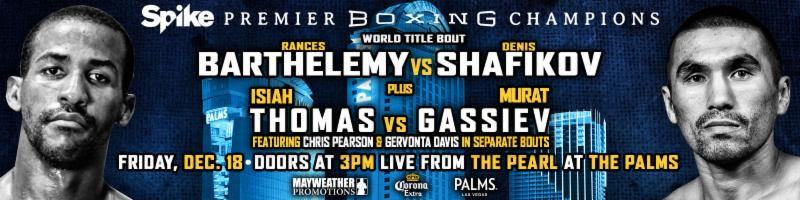 PBC on Spike is headlined by undefeated Cuban Rances “Kid Blast” Barthelemy (23-0, 13 KOs) and Russia’s Denis Shafikov (36-1-1, 19 KOs) in a lightweight world title fight, plus undefeated junior middleweight Chris “Young King” Pearson (13-0, 10 KOs) and rising unbeaten prospect Gervonta “Tank” Davis (13-0, 12 KOs) in separate attractions.