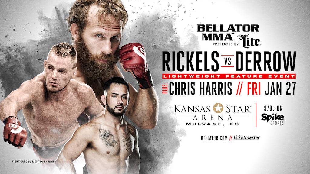 SANTA MONICA, CALIF. (November 28, 2016) – A lightweight bout pitting Kansas’ most popular MMA fighter David Rickels (17-4, 2 NC) against Aaron Derrow (14-8) and a middleweight bout featuring undefeated phenom Chris Harris (7-0) versus Jordan Young (5-0) are the first two fights announced for “Bellator 171” which will take place inside Kansas Star Arena in Mulvane, Kansas, on January 27.