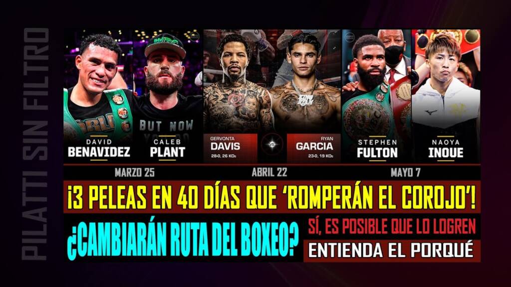 David Benavidez vs. Caleb Plant, el 25 de marzo, Gervonta Davis vs. Ryan García el 22 de abril y Naoya Inoue vs. Stephen Fulton el 7 de mayo, ocurrirán durante los próximos cuarenta días, son peleas muy diferentes entre sí, pero con un denominador en común: pueden ser el revulsivo que cambie para siempre la ruta del boxeo.