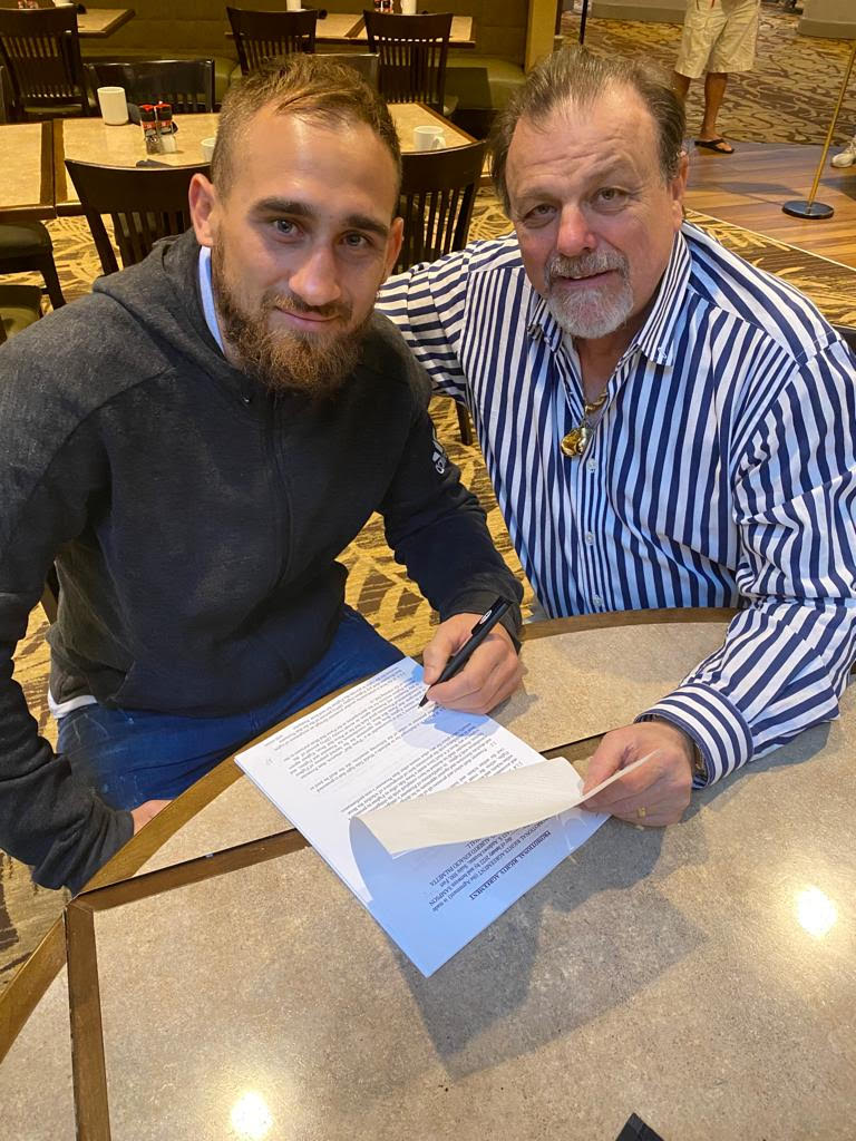 Alberto Palmetta firmando el contrato con Sampson Lewkowicz (Foto: Sampson Boxing)